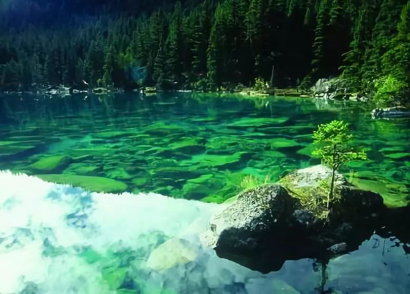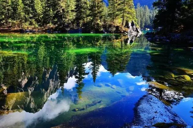 湖边翠绿的森林,湖心蔚蓝的天空倒影,湖色由近到远呈现出银白、湛蓝、深青、墨绿的神奇色谱。
