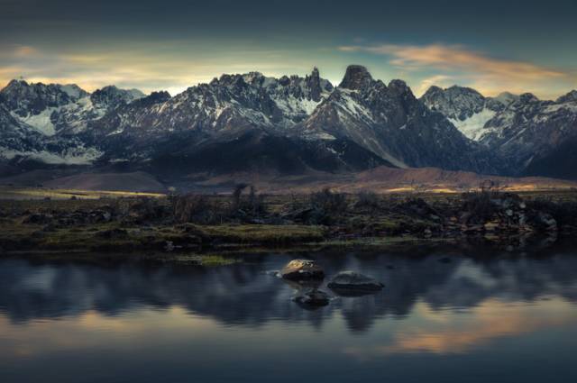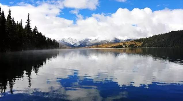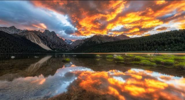 措普湖最迷人的,是那色彩多变的湖色:日出时分,彩霞铺满了天空,清碧亮丽的湖水,平静无语地置于一片金色的阳光下。
