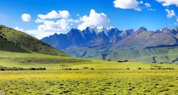 雪山环拥下,普错沟内的章德大草原在蓝天的映衬下,犹如天然画卷。这里,牛羊漫步、鲜花灿烂、炊烟袅袅,一望无际。