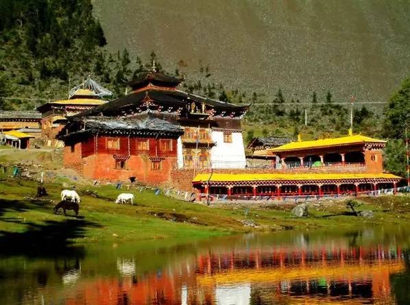 这里是藏传佛教中“宁玛”派寺院,背依扎金甲博神山,面对措普湖。这里经幡飘扬,法号阵阵。