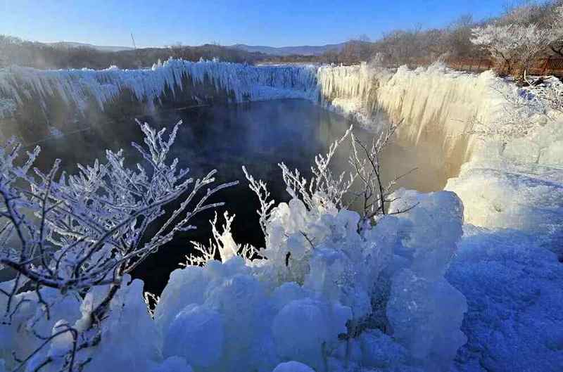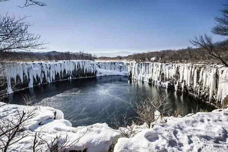 最令人称奇的就是吊水楼瀑布,落差高达20米。曾经水珠四溅的景色在零下的温度下,通通结成了晶莹剔透的冰,呈现了另一种华丽的美感。