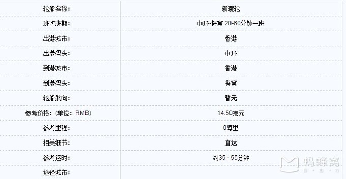 3.船中环-梅窝 到了中环码头后前往六号码头就有去梅窝的船,大概是6:00-23:30之间都有船,40分钟左右一班。船只分为高速船和普通船,高速船速度是普通船的两倍,价钱也是两倍,可使用八达通卡和现金支付。普通船中又分为贵宾位和普通位,两种座位价格分别不同,碰上星期日和公众节假日票价更高。 香港新轮渡公司推出普通位一次来回的优惠票价,仅限于现金支付,轮渡窗口购买,不得逾期使用。