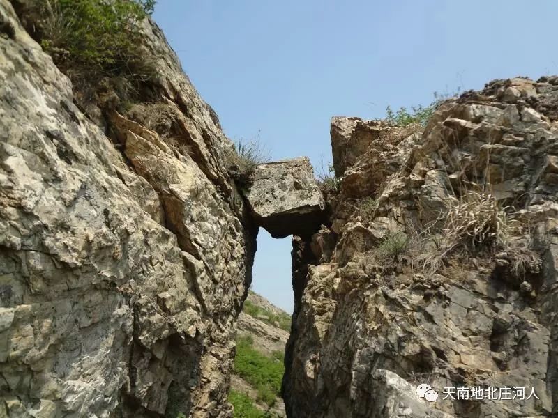 在悬崖的中部,有高2.7米,宽0.6米,顶端卡着一块半米厚的大石块,形成一个天然的大门洞,俗称通天门。相传如果走过了这道门,会给人们永远带来好运。