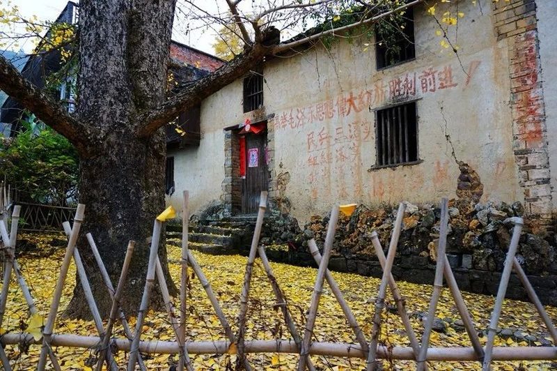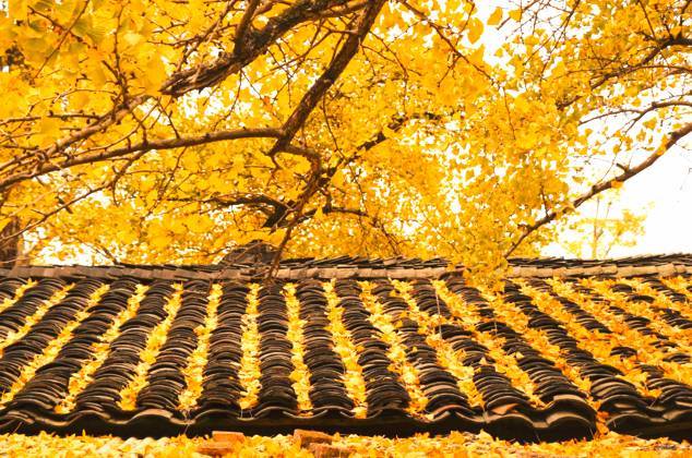 每年深秋时节,金黄的银杏叶便簌簌地落在老屋上,黑色砖瓦就像镶了道道鎏金,古时大户人家的金色琉璃瓦恐怕也不及这般“金光璀璨”。