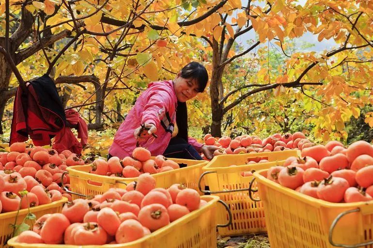 在这里,枝头挂着的、筐里摘下的、院子里晒着的……随处可见的橘红,是秋天最动人的一抹色彩。