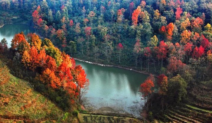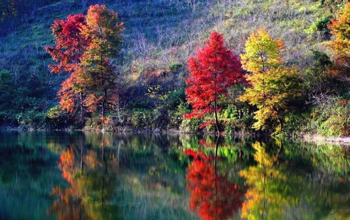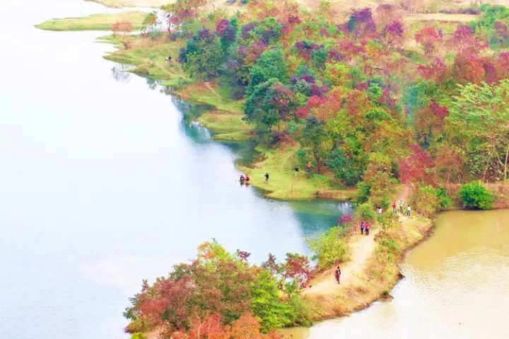 每年秋天,上岗水库旁的枫树便开始变渐渐红。红黄橘绿的树影,落在幽静的湖面上,水波荡漾开一个多彩的梦,让人流连,让人忘返。