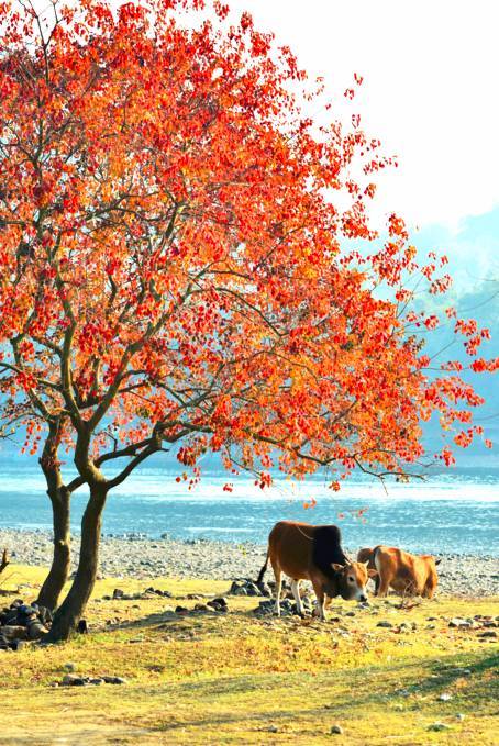 每年秋冬时节,漓江上一丛丛的乌桕林就开始浸染秋红。那一簇簇的乌桕林,远望时,好似团团殷红的火焰,在碧色的漓江水上熊熊燃烧。