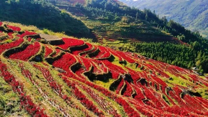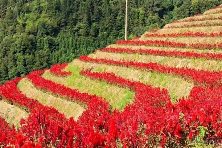这些一条条的红色风景线都是梯田大量种植红色鸡冠花,整个寨子均为红瑶居住地,原始韵味充足,当鲜花盛开,层层而上,颇具特色,蔚为壮观。