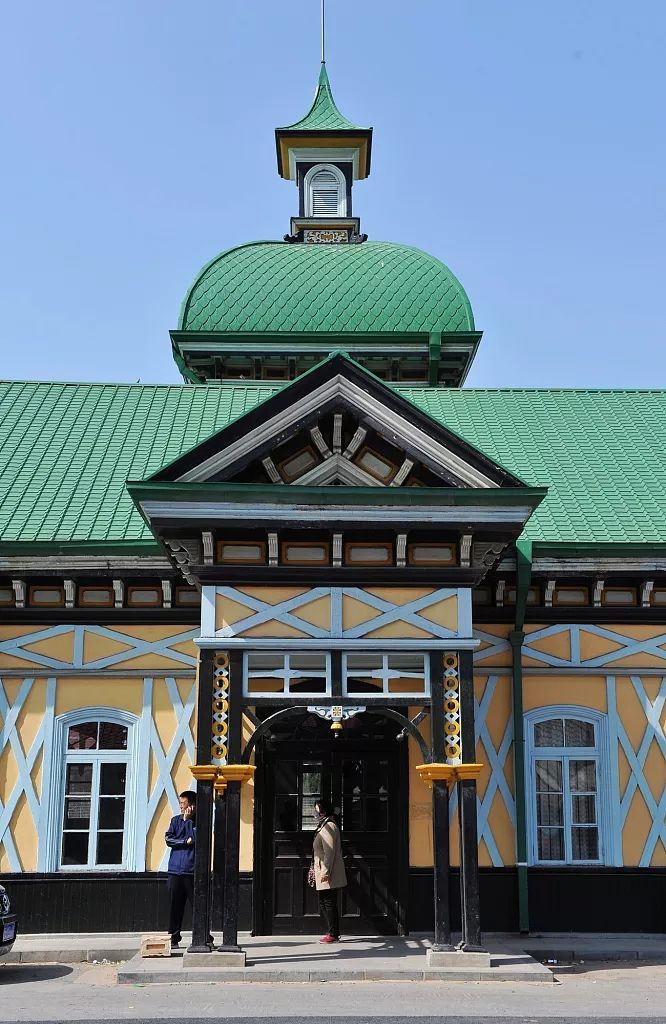这是一座造型别致的俄式木质建筑物,绿色的草帽形椭圆尖顶,黄墙搭配着白色的窗户和装饰,色彩明艳,拍起照来十分上镜。