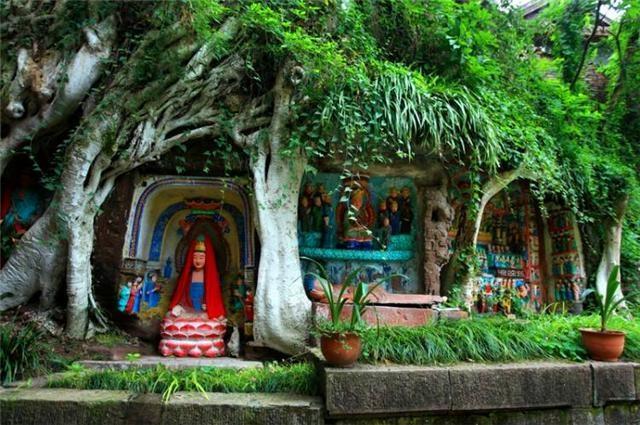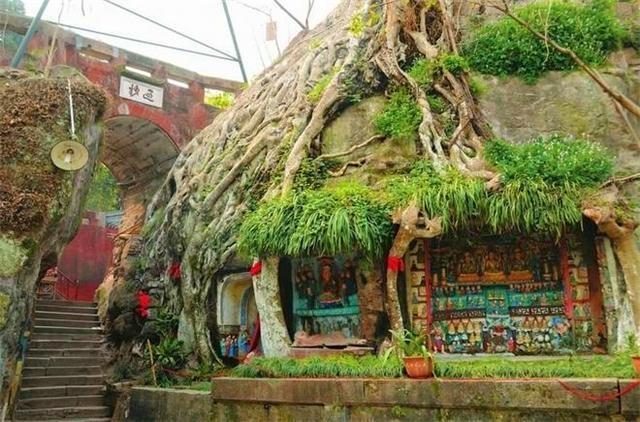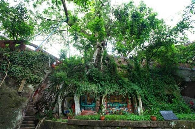 其实我们仔细观察会发现,古榕树的根系长盘旋生长在一块巨石之上,只是因为榕树根系太发达,四周又长满了树叶杂草,所以佛龛似乎“长”在树根上,其实是雕凿于巨石中,属于“摩崖造像”。但是即便如此,这株“树抱佛”仍然令有许多未解之谜。当年考古专家对其进行研究考证,发现这上千尊佛像在盘根错节的树根中已长达千年之久。但到底是先有树还是先有佛,则一直存在争议,至今没有定论。而这个未解之谜,也成为报国寺景观一绝,吸引着许多游人的目光。