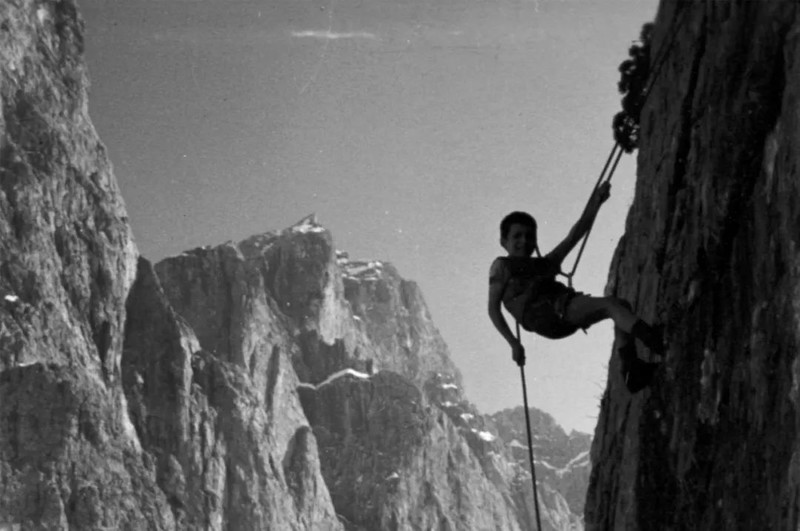 逃离专制的父亲,将自己全然交付给山,这对兄弟搭档很快在攀登上小有成就。23岁那年,梅斯纳尔和弟弟一起攀登了Heiligkreuzkofel。这是一座海拔2970米的山峰,有着一面高约600米的巨大岩壁。几乎垂直的山体如一面大墙,下方是万丈深渊,他们只能悬垂着休息睡觉。