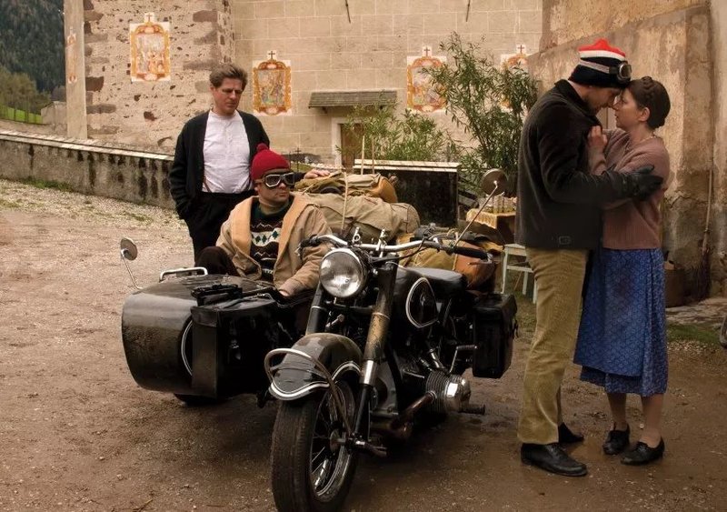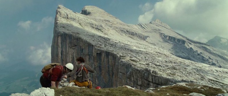 电影《南迦帕尔巴特峰》就是以攀登Heiligkreuzkofel开场。梅斯纳尔领攀,下方的冈瑟突然喊道:“绳子不够了!”顶峰在望,梅斯纳尔干脆脱离保护,开始徒手攀登。冈瑟气急败坏地跟上,登顶后,他望了一眼赔笑的哥哥,气鼓鼓地坐下来,摘掉头盔,连珠炮一般说着:
