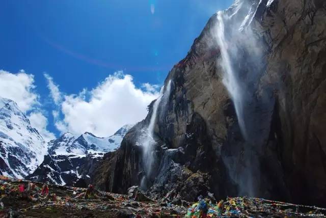 投射在雨崩神瀑滑落的悬崖绝壁上