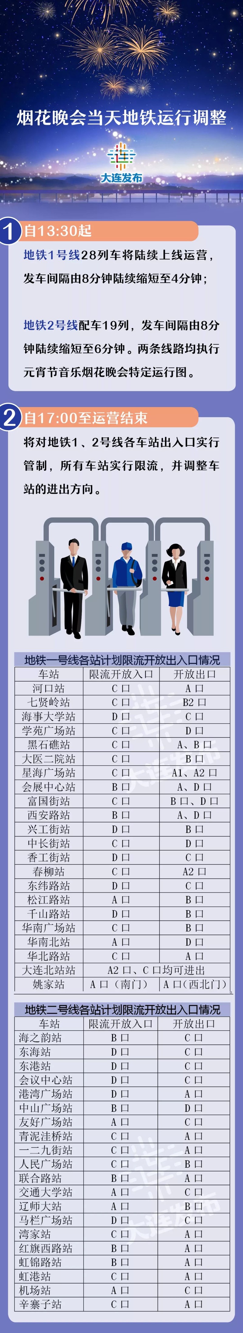 烟花晚会当天,大连地铁集团将对地铁1、2号线车站出入口实行管制,视客流情况对部分地铁车站采取封站、限流、站内楼梯与扶梯单方向通行等措施。