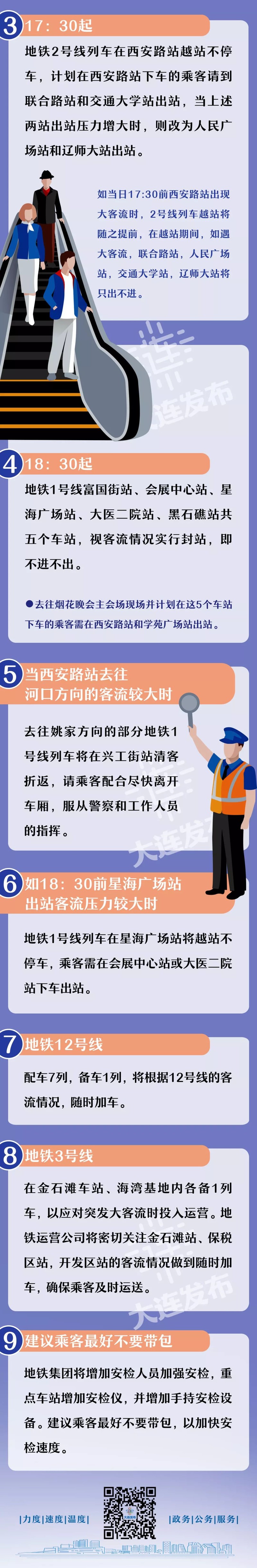 届时,请留意大连地铁公众号、微博和车站出入口的公告以及车站和列车的广播,请服从警察和工作人员的指挥引导,有序进出站。
