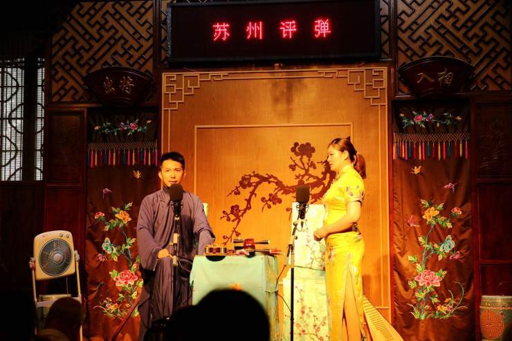 大儒巷三十八号是苏州市平江文化中心,一进院落主体建筑鸿儒书房,内为苏州市图书馆分馆,书籍不多但胜在古韵悠悠。我去图书馆看书,书看久了转至后院听评弹。“吴苑深处”书场下午开场弹唱,时长两个小时。当日是吴中区评弹团两位青年演员表演长篇弹词《末代皇妃》,周围应当是老街坊们,他们相互招呼,喝着书场提供的水自带的茶,开场后静静地听书更不乏中间睡去者。