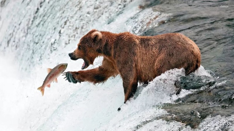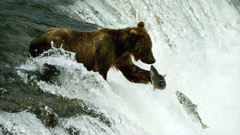 每年夏秋之际,无数鲑鱼洄游至这里产卵,棕熊捕鱼是《国家地理》摄影师们年年蹲守的画面;