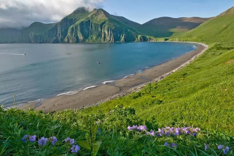在阿瓦恰海湾,火山岩浆被海水腐蚀冲碎后,形成上百里的黑沙滩。沙子通体黑色,海水却依旧湛蓝,加上苍绿的火山原野,美得摄人心魄!