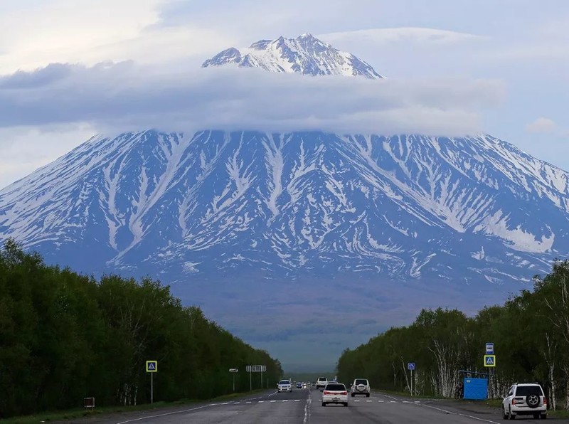 驾车沿着阿瓦恰湾的公路一路往南开,远远地就能看到穆特洛夫斯基⽕山。这座火山海拔2323米,由4个连成一体的火山锥构成,是勘察加最大、最“热情四射”的活火山之一!