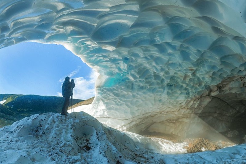 而在冰川之下涌动的热流,将冰川融化出一条长长的隧道,阳光透过冰面洒下来时,冰洞中幽蓝深邃,最是迷人!