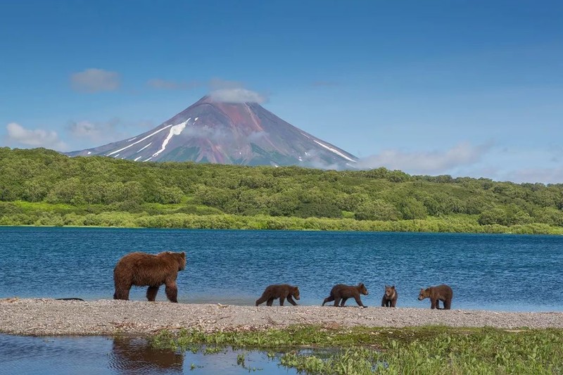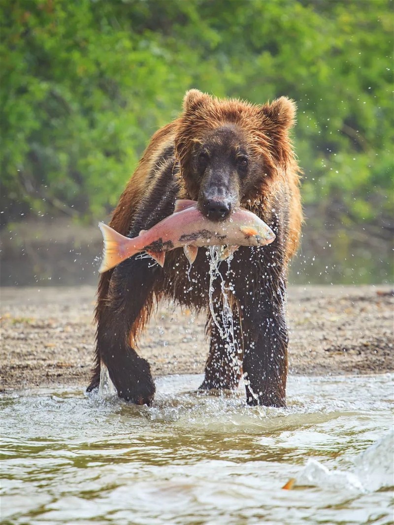勘察加南部的库页湖是近距离观察这场盛宴的最佳之处。大熊带着小熊,守在河口边,随手一抓就是一条肥美的红鲑鱼,有的甚至只用张嘴,就等着鱼儿们跃入熊口。