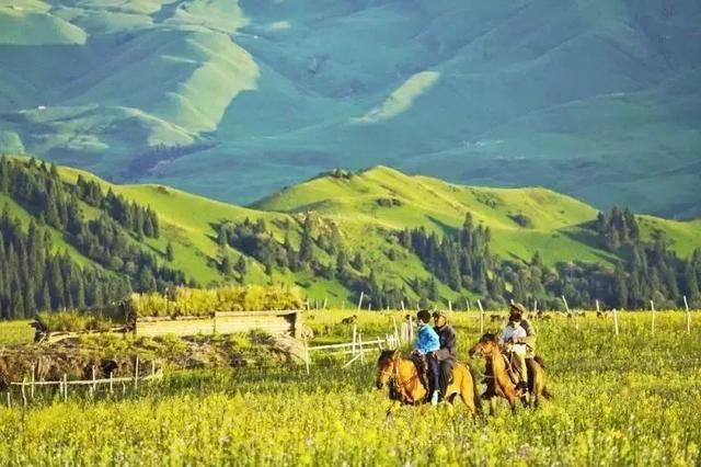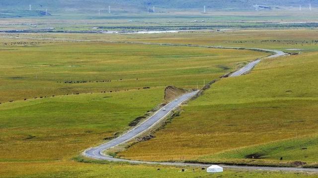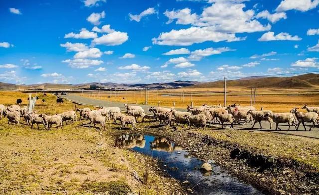 笔直的公路延伸向远方,蓝蓝天空上漂浮着的朵朵棉花糖,成群结队横穿马路的羊群,在路边惬意悠闲的马匹,出现在同一个画面里。