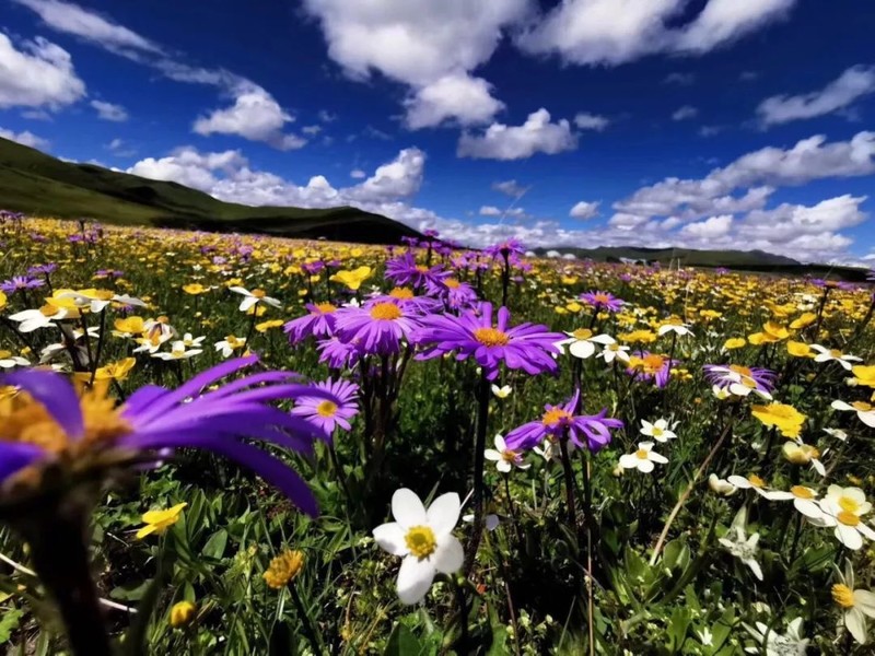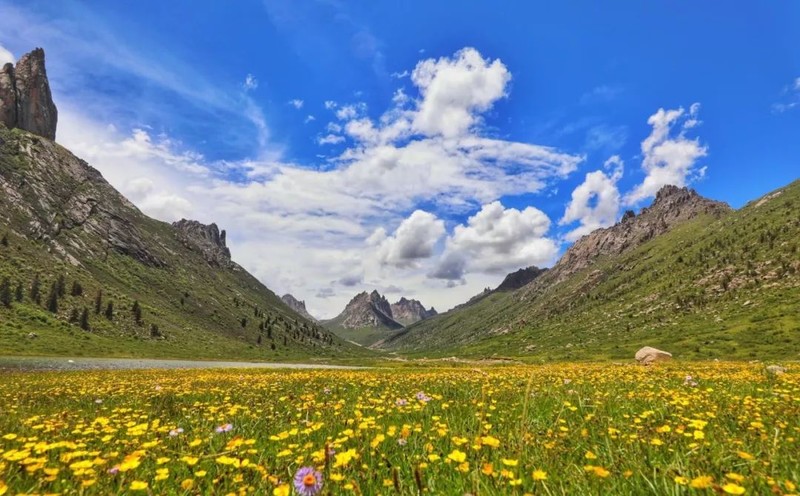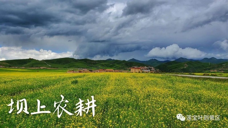 赏花路线: 从阿坝县城到莲宝叶则石头山风景区沿途的村村寨寨都可以看到油菜花、 野花竞相开放。