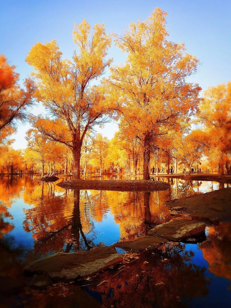 走近其中,蔚蓝色的天与千姿百态的金色胡杨,则在水中倒映出另一个斑斓的世界。