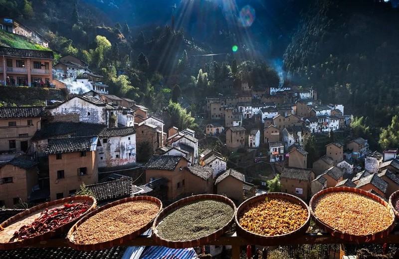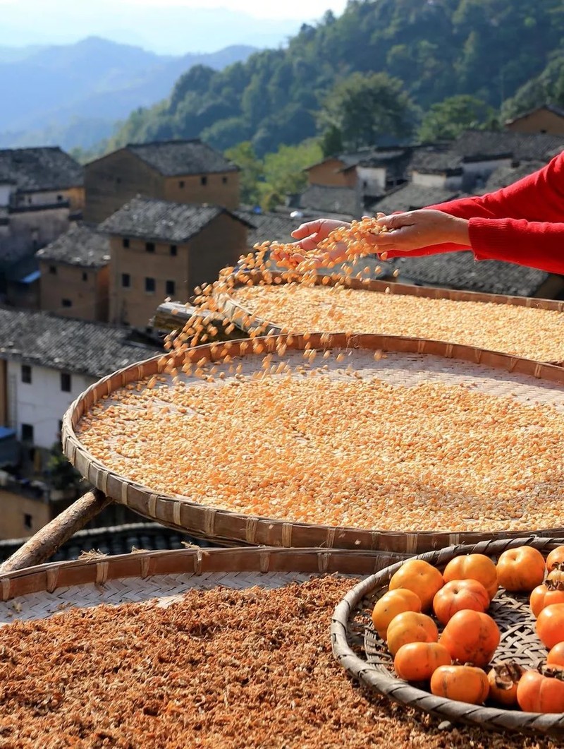 晒架、外墙上放满了圆圆的晒匾,晒匾里堆满了五彩缤纷的果实,与黄墙黛瓦的徽派建筑相互映衬着,煞是好看。