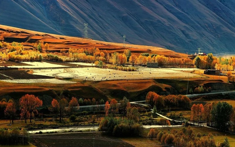 光影中的山峦如诗如画,路边柏杨叶子金黄,草原无垠宽广,藏寨错落有致……秋天的新都桥,就像是被阳光施了魔法一般,到处都闪烁着温暖的金色光辉。