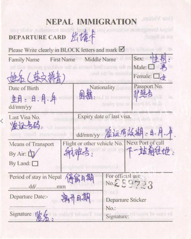 比入境手续简单很多,只要你没有带走什么违禁物品,只要到机场通过安检,办理登机手续,前往候机楼等候登机即可!离境需要填写离境表格,请按照下图表格指示填写即可。