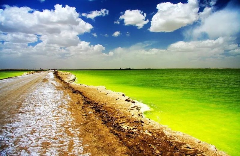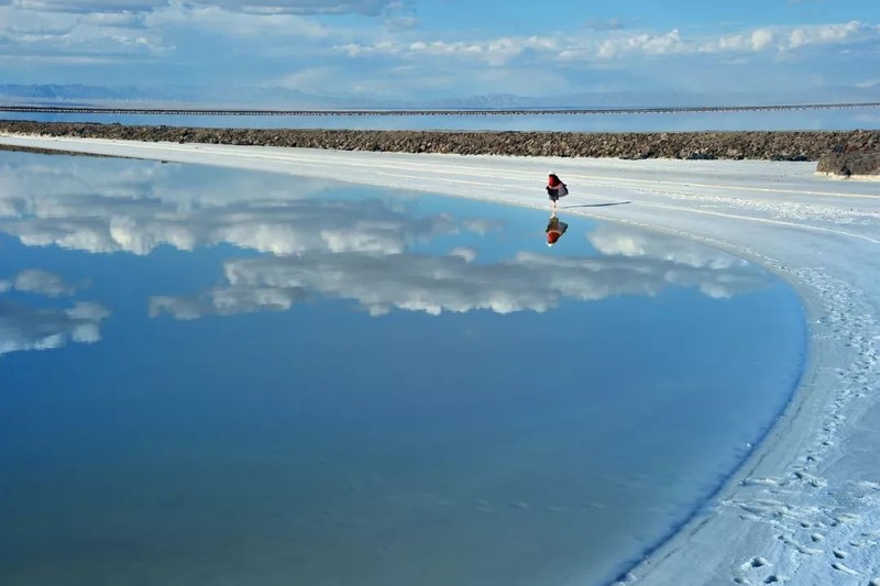 公路就像一座桥浮在卤水上面,盐桥全长为32公里,横跨整个盐湖,素称“万丈盐桥”。