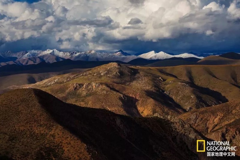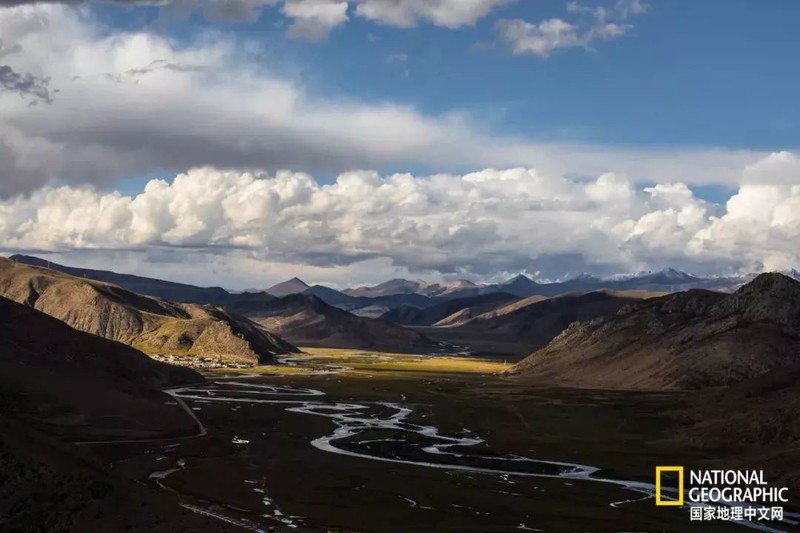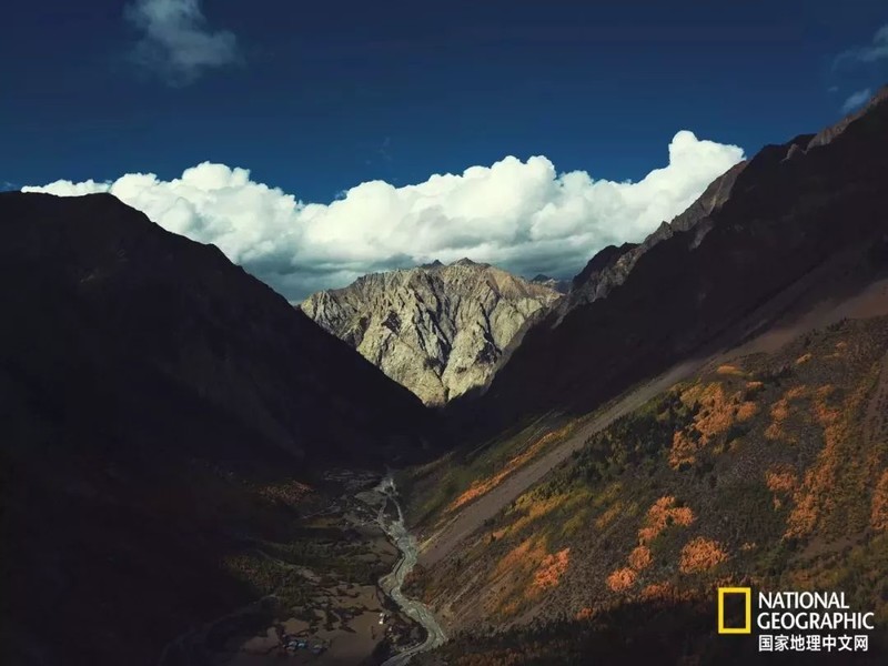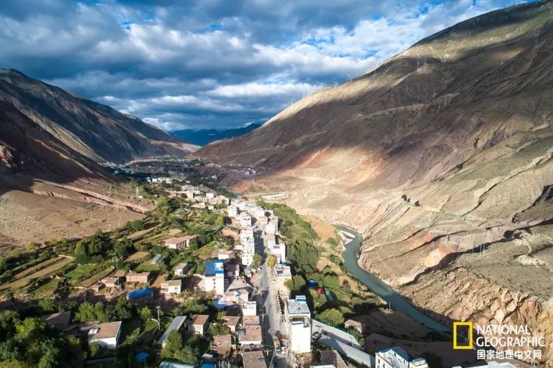即将到达怒江72拐。这里看到的是邦达镇。阳光照耀在邦达镇一方的山坡上,我们所站的位置是业拉山—海拔4658米。