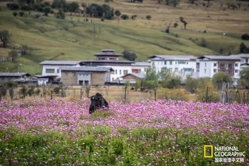 在鲁朗小镇的路边,一头牦牛在花丛中。