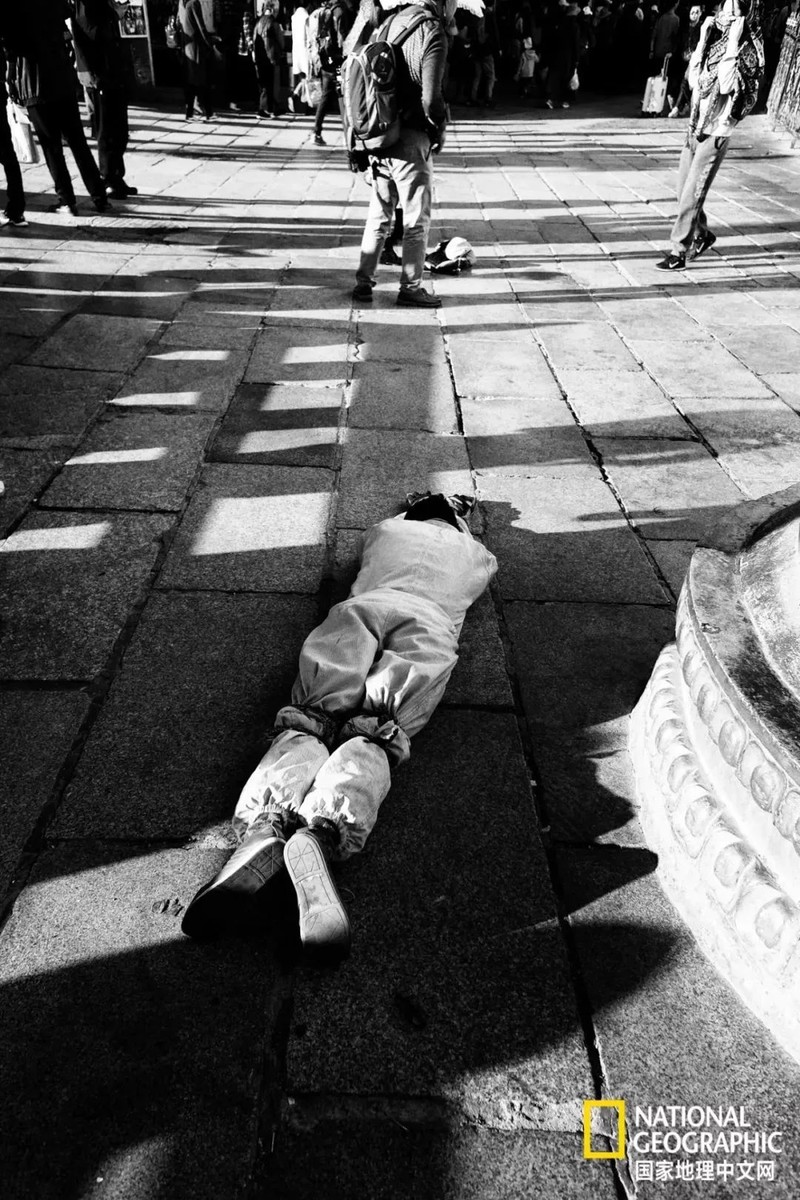 这张让我感触很深,这位藏民小伙是一位小儿麻痹症患者,他每次站立起来非常艰难,而每次叩拜下去仿佛是摔下去一样,“咚”的一声撞击地面很让人心疼。他的人生或许没有我们正常人如此丰富多彩,临时起意,我把这张照片拍成了黑白。
