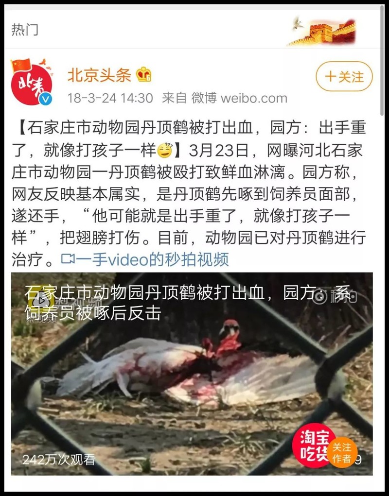 石家庄动物园饲养员殴打丹顶鹤事件。