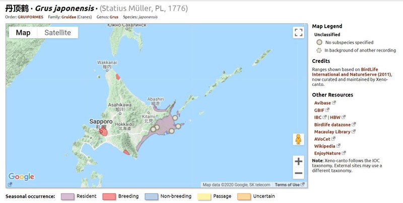 北海道丹顶鹤种群,红色为繁殖地,紫色为越冬地丨xeno-canto.org