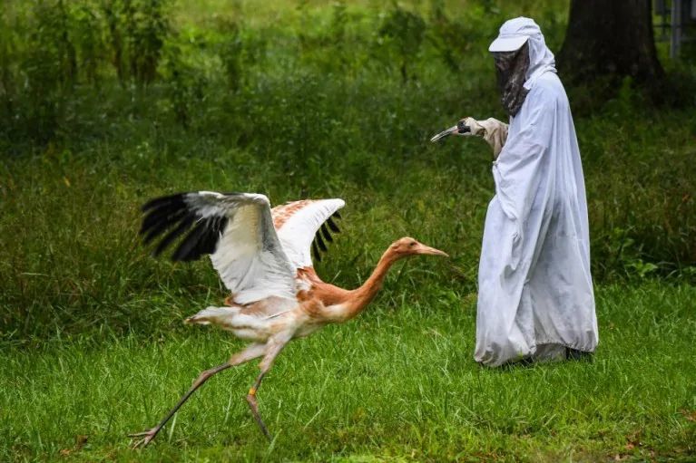 美洲鹤( Grus americana )是北美最高大的鸟类,曾经一度陷入灭绝的边缘,美国研究人员为帮助其恢复种群和迁徙能力,付出了巨大的努力。图为穿着带有美洲鹤模型的工作服的工作人员与一只两个月大的幼鹤。Salwan Georges / The Washington Post