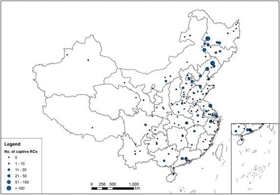 2013年,中国141家动物园和16个自然保护区内圈养丹顶鹤的数量。本文第一作者周大庆,是生态环境部南京环境科学研究所副研究员;通讯作者蒋明康,是生态环境部南京环境科学研究所研究员、自然保护区管理研究学科首席专家。Daqi丨ng Zhou et. al. / Avian Research (2016)