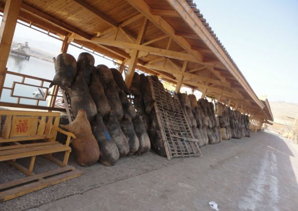 这种羊皮筏俗称“排子”,是将山羊割去头蹄,然后将囫囵脱下的羊皮, 扎口,用时以嘴吹气,使之鼓起,十几个“浑脱”制成的“排子”,一 个人就能扛起,非常轻便。乘羊皮筏子渡黄河有一种很穿越的赶脚。