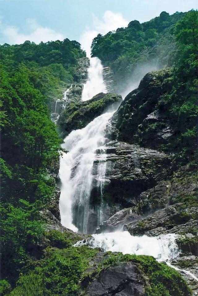 神龙飞瀑相对落差600米,瀑布流过山涧,穿过断崖,于古木森森掩映处,发出震耳欲聋的声音。