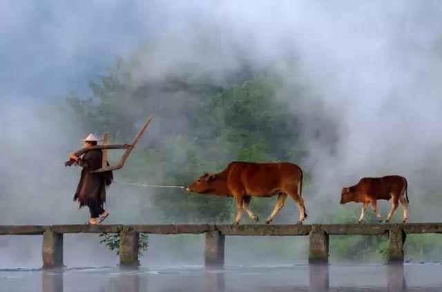 两桥之间的长堤叫做“仙堤”,境内九曲练溪,云雾缭绕,常有村民牵牛而过。