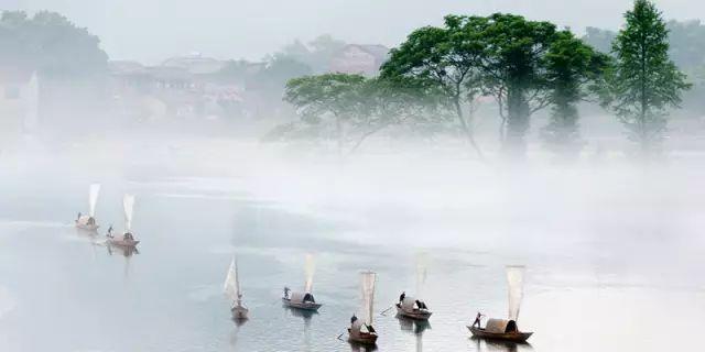 色彩饱和的蓝天白云,一只竹篙,一叶扁舟,一江碧水,皆可入画。