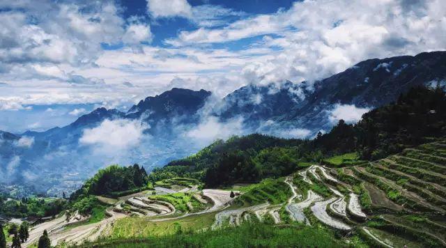 错落有致的梯级田畔层层叠叠,在眼前山谷下铺开,云雾缭绕其中,远处山峰隐现。