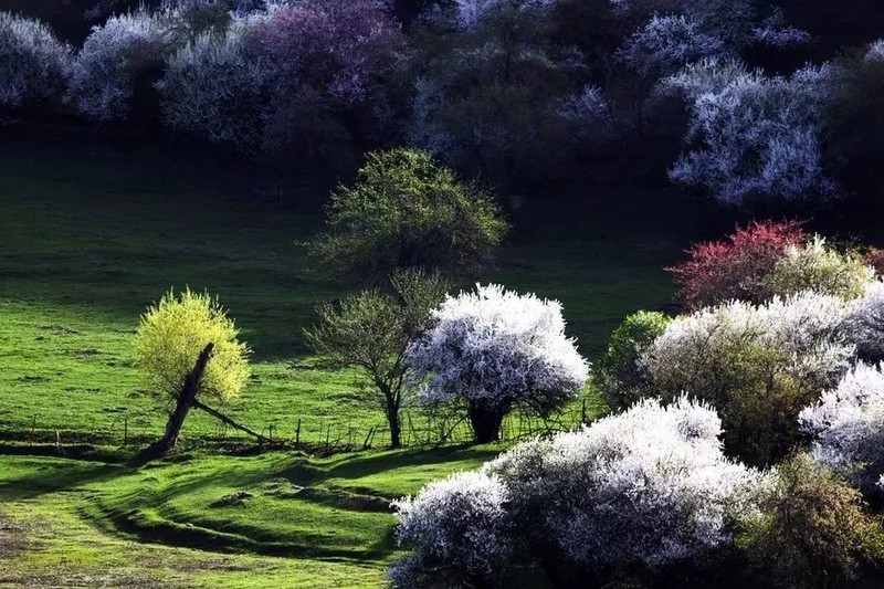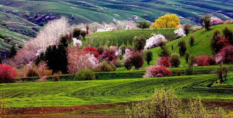 每年四月这里的杏花、苹果花等逐次开放。加上布满整个山坡的各色野花和青葱的山坡,如铺满五颜六色的花毯。