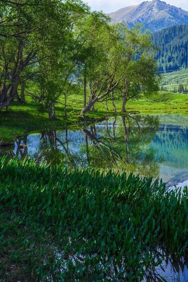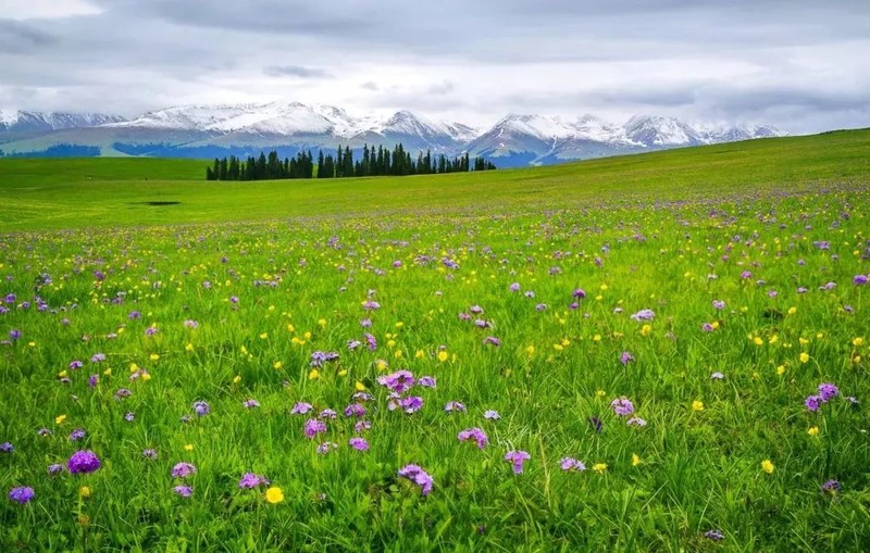那拉提的春天一到来,青草和山花,白云和牛羊,河流和毡房,还有远方巍峨的雪山,给人一种无所言喻的美。