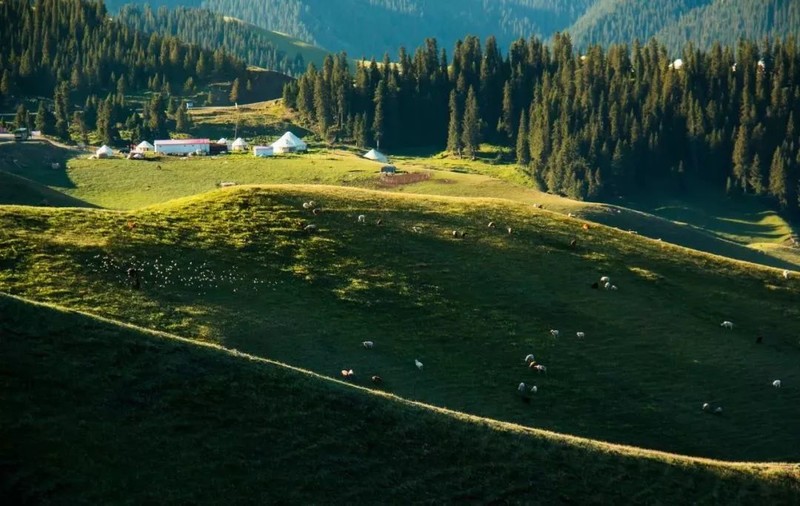 每年5月到9月,上百种天然牧草花朵在不同的海拔依次绽放,或红或白,浅浅地铺在草甸上,近3万头牛羊随意散落在草原的各个角落,悠闲至极。