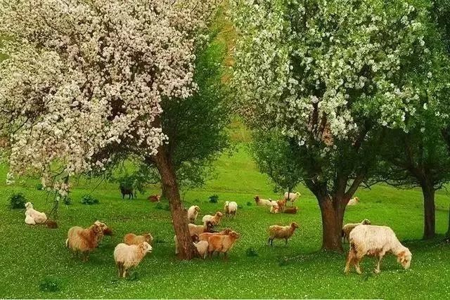 每年5月,杉山坡上的林木花开成海,或白或粉的花朵扑簌而下,落在树下安心吃草的牛羊身上,静谧美好。
