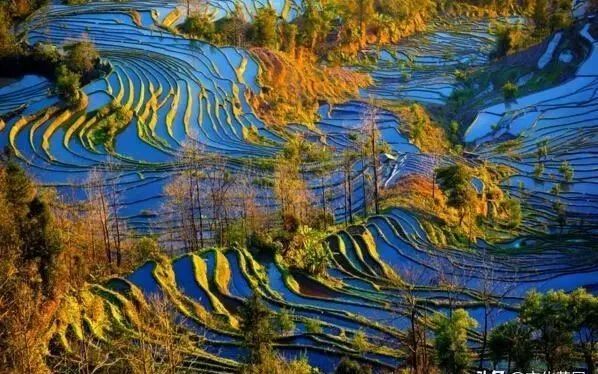 梯田的线条,婉约曼妙,如行云流水,潇洒飘逸,如少女游弋,柔情万钟;梯田的形状,或如片片鱼鳞,或如恐龙脊骨,或如漩涡涟漪,或如木刻浮雕,特别是夕阳照射下的田埂,如墨汁描画;块块水面,如少女美面,轻施粉黛,光洁靓丽。