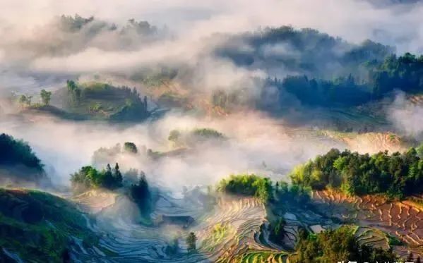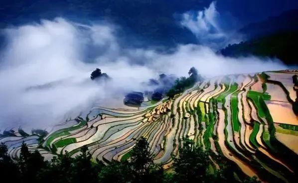 在茫茫森林的掩映中,在漫漫云海的覆盖下,层层叠叠的梯田,无边无际,直通天际,随着光线的变化,一会儿,像艳丽的油画,一会儿,又像素淡的水墨画,构成了神奇壮丽的景观,如同千奇百态变幻莫测的天地艺术交响乐。